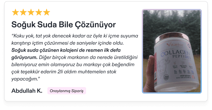 Müşterilerimizden en sık duyduğumuz yorumlardan biri, Vitarise kolajenin piyasadaki diğer ürünlere nazaran ne kadar da tatsız ve içimi kolay olan bir kolajen olduğu şeklinde. Vitarise kolajen neredeyse hiçbir tat içermez ve yediğiniz/içtiğiniz şeylerin tadını değiştirmez ve çok hafif ve nötr kokusu dışında hiçbir kokusu yoktur.
