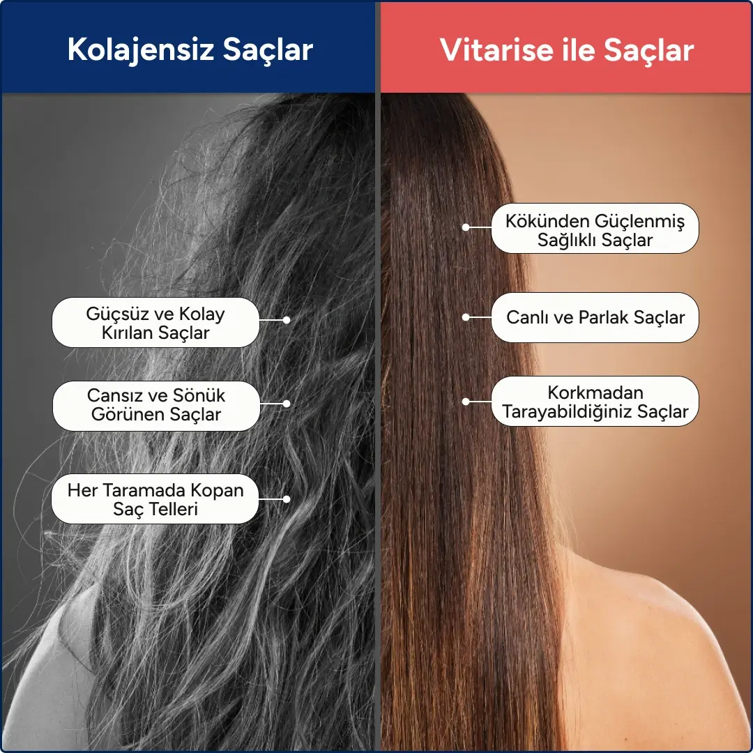 Vitarise Kolajen ile canlı ve parlak saçlara kavuşurken, saçlarınızı korkmadan tarayabilir ve şekillendirebilirsiniz.
