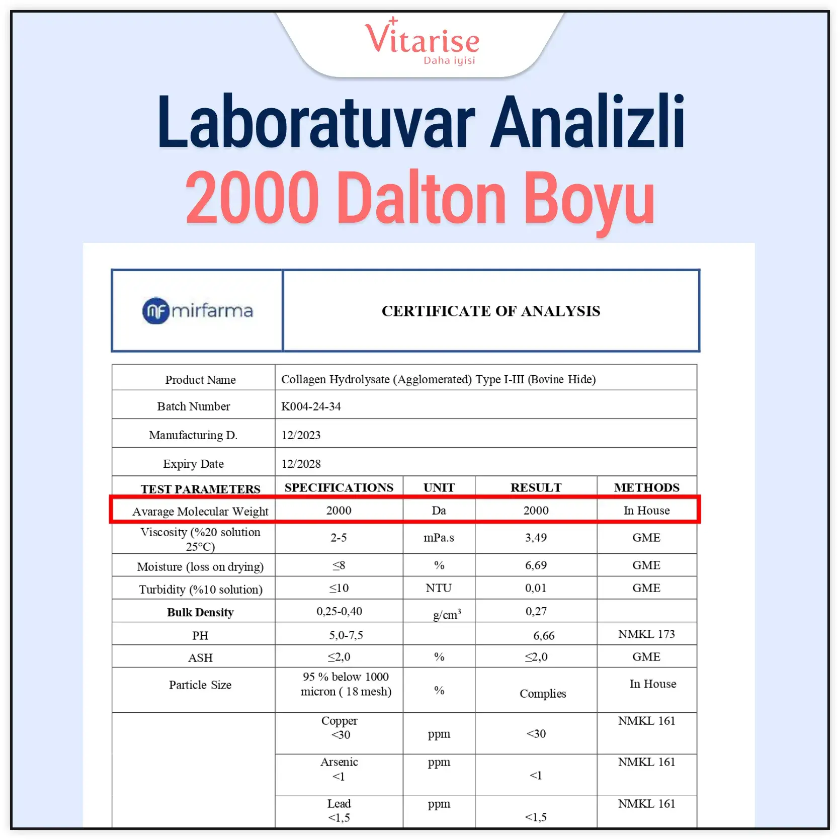 Piyasadaki birçok marka kolajen peptitlerinin 2000 dalton boyunda olduğunu iddia eder, ancak neredeyse yalnızca Vitarise bunu laboratuvar analiziyle ispatlayacak kadar ürününe güvenir.